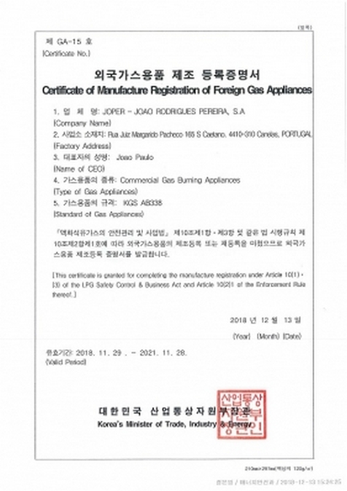 Joper Roasters has received once more the KGS Certification – Certification of Manufacture Registration of Foreign Gas Appliances – for the South Korean market.